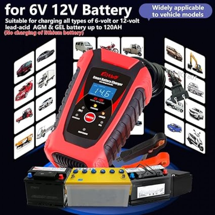 Інтелектуальний автоматичний зарядний пристрій 6A, призначений для заряджання, підтримки та обслуговування свинцево-кислотних акумуляторів з напругою 6V та 12V. Підходить для автомобілів, мотоциклів, човнів, газонокосарок та іншої техніки. Оснащений 8-етапною системою зарядки, LCD-дисплеєм з підсвіткою та режимом підтримуючої зарядки, що подовжує термін служби акумулятора.